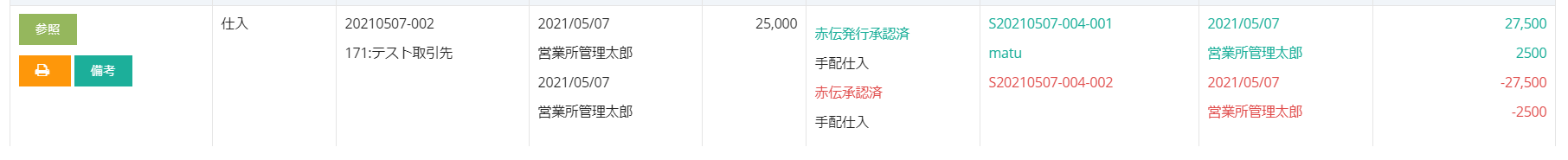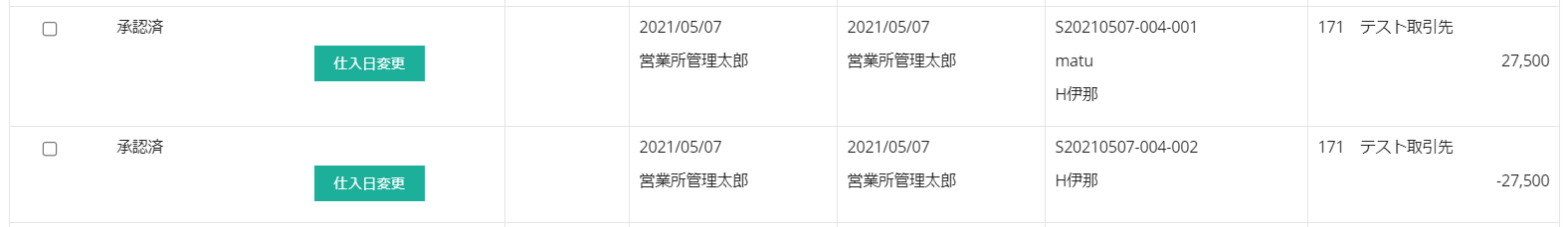 元になる仕入データはそのまま表示されます。マイナスのデータが新規で追加されます。