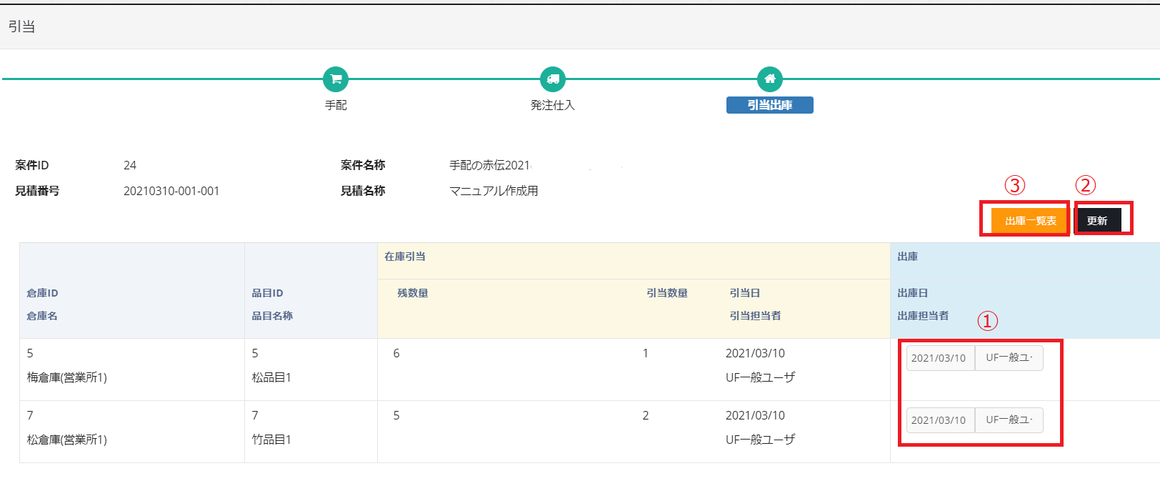 「更新」ボタンをクリック後に出庫一覧表を出力すると、出庫日・出庫数量・出庫担当者に値が入ります