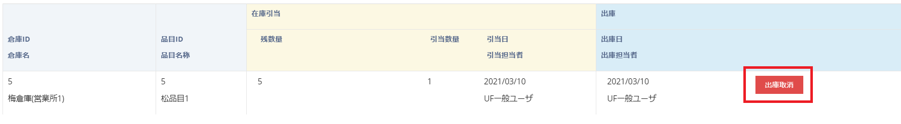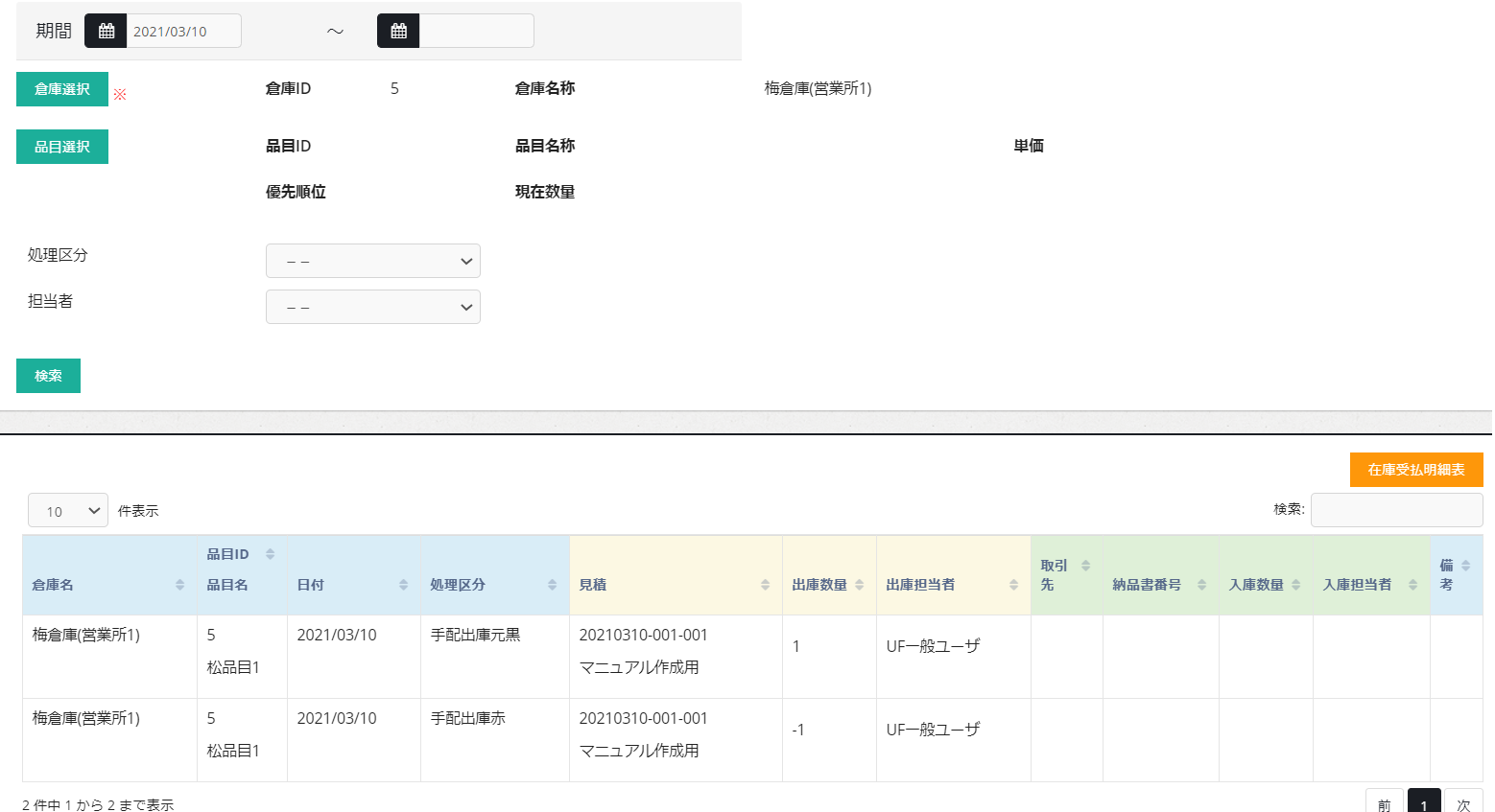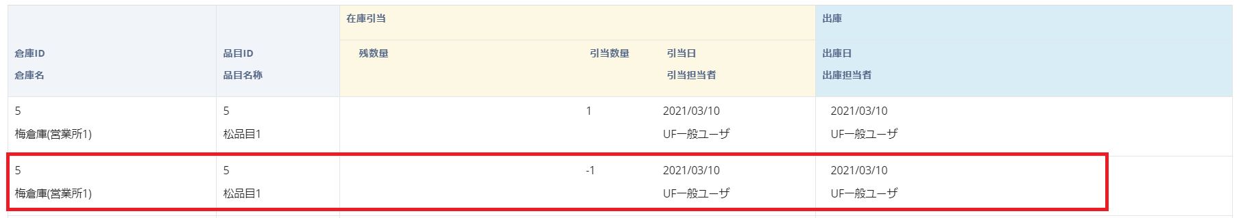 在庫から引き当てる品目は、在庫保管場所(倉庫)と引当数量が初期表示されます。