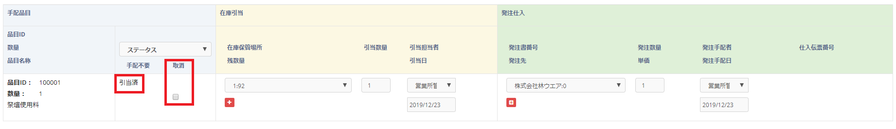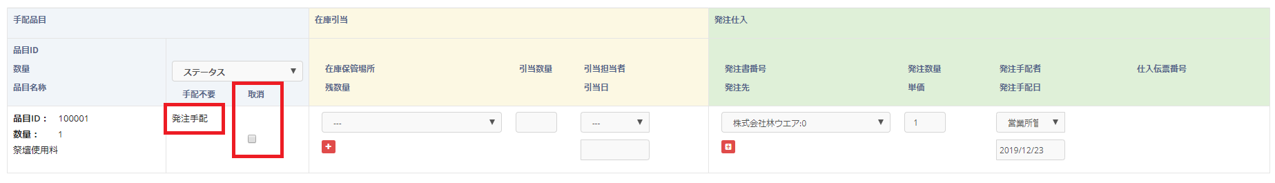 取消にチェックボックスを入れて「手配」をクリックすると、手配データを取消することが可能です