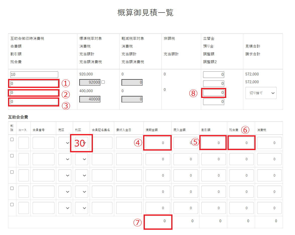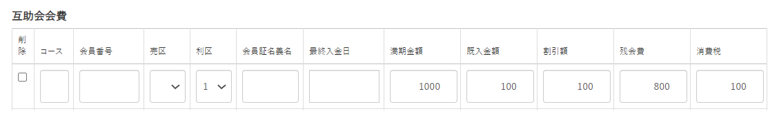 ⑥残会費欄は、④満期金額ー既入金額ー⑤割引額 の自動計算値が入ります。