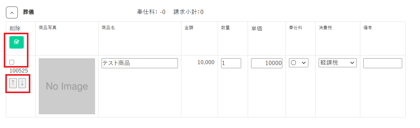 緑のチェックボックスをクリックすると、タブに追加されている商品に一括で削除フラグを立てることが可能です。その後に更新ボタンをクリックすると保存されます。