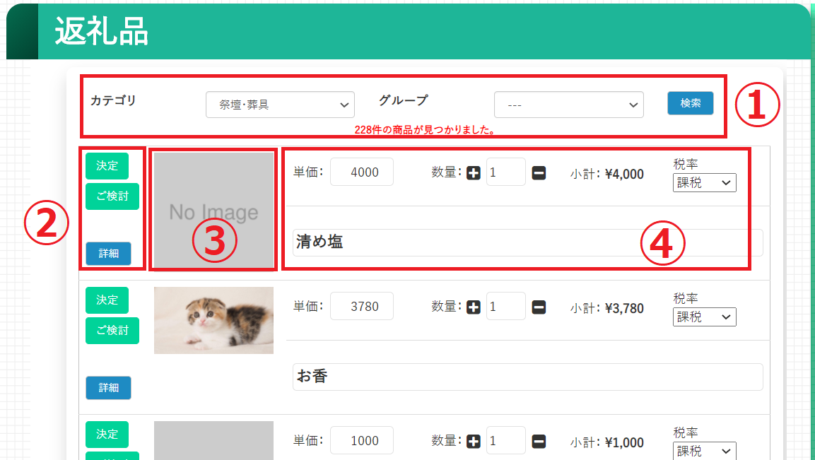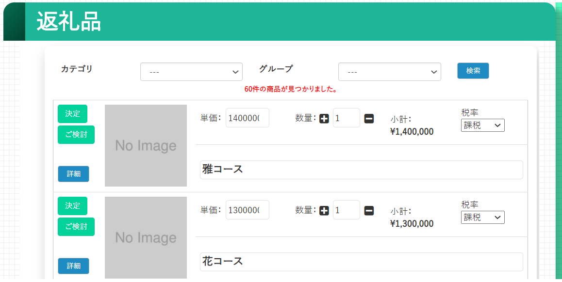 このエリアで編集を加えた状態で決定・ご検討ボタンをクリックすると、その状態で決定リスト・検討中リストへ商品が追加されます。