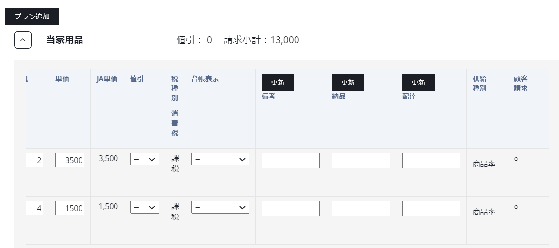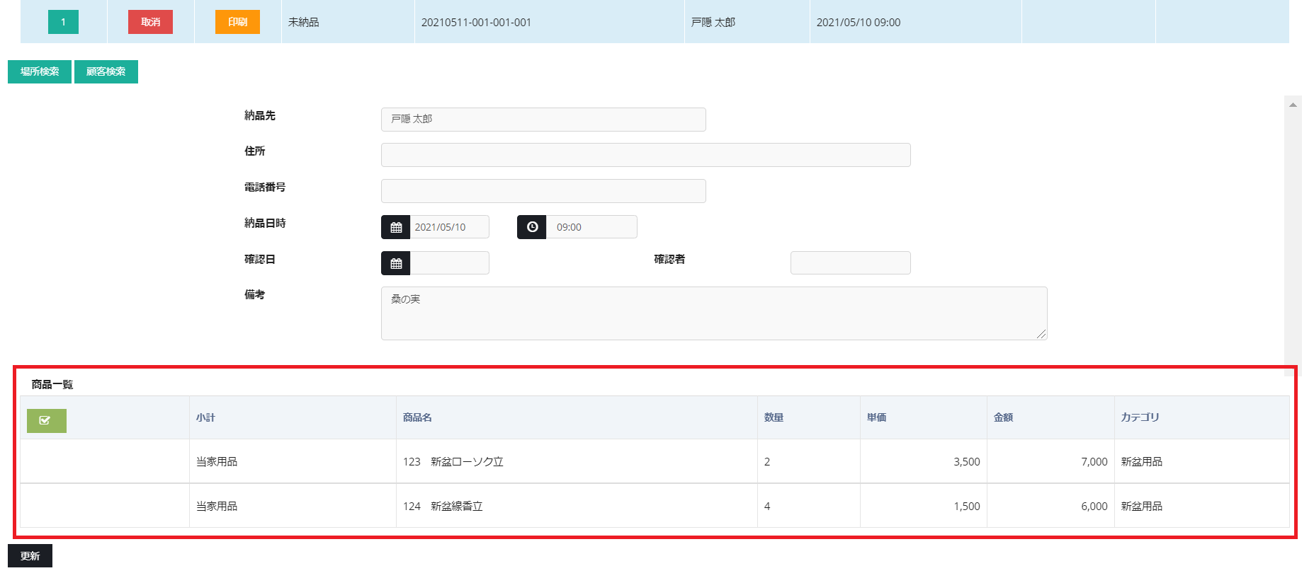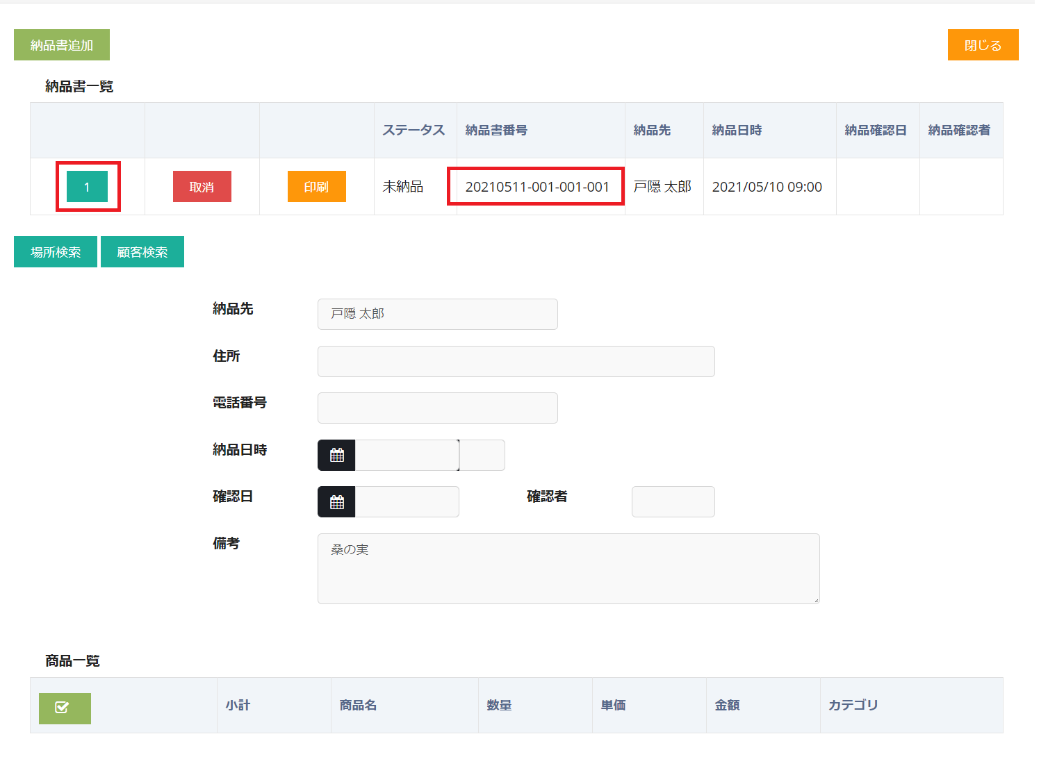 納品書一覧の左に表示されている番号をクリックすれば、納品書の商品詳細が確認することができます。また、納品情報を編集後に更新ボタンを押下すれば、納品情報の更新も可能です。