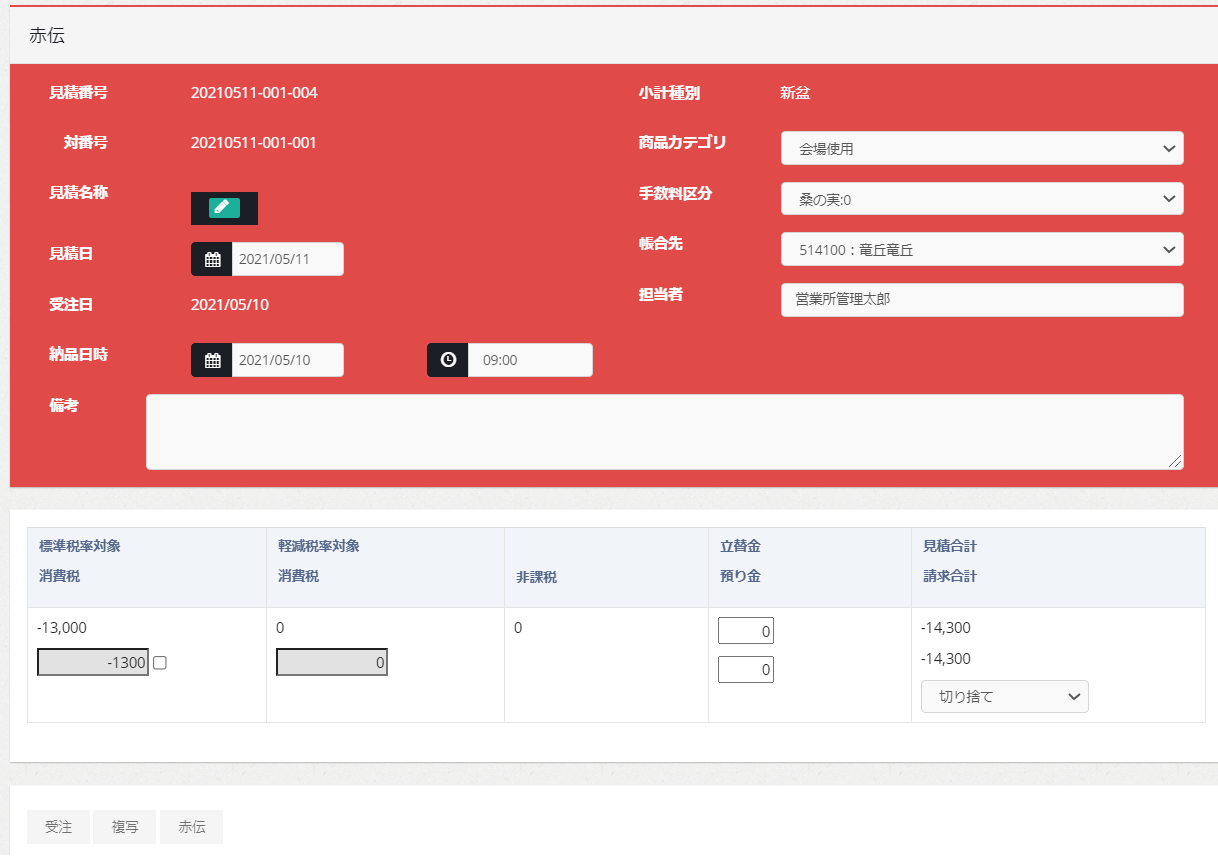 赤伝ボタンを押下すると、赤伝元の見積額のマイナス値で「赤伝 受注済」のレコードが作成されます。