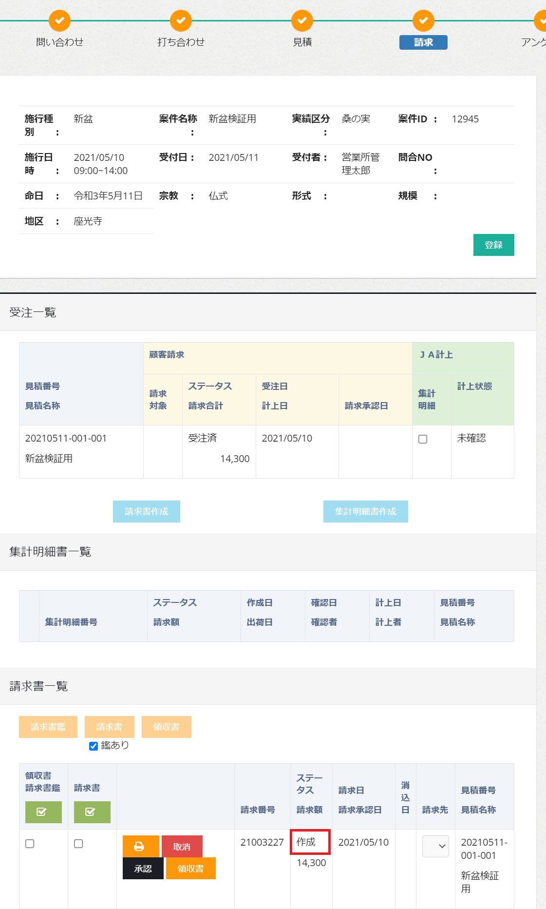 新盆モードで受注を行うと、見積書・納品書・請求書が自動で作成済みとなります。