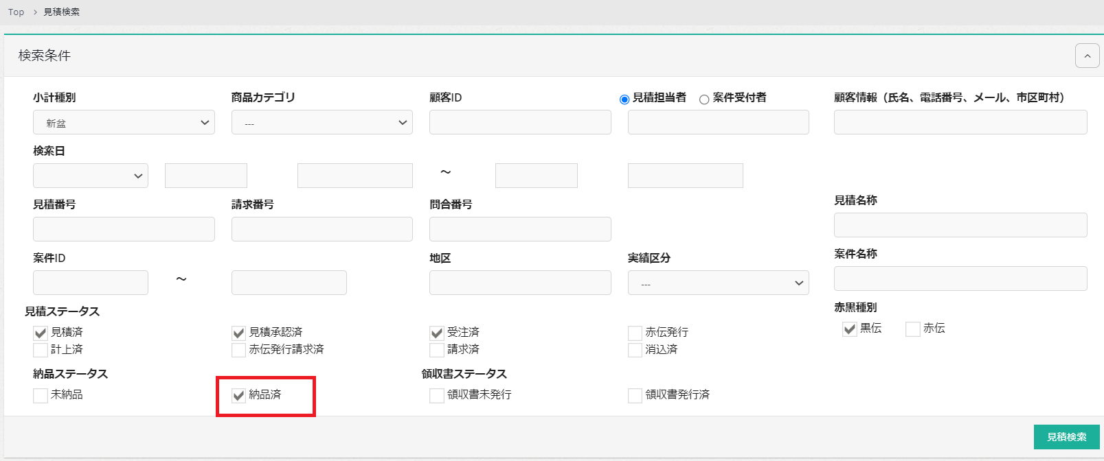 納品済ステータスになると、見積検索画面の新盆モードで、