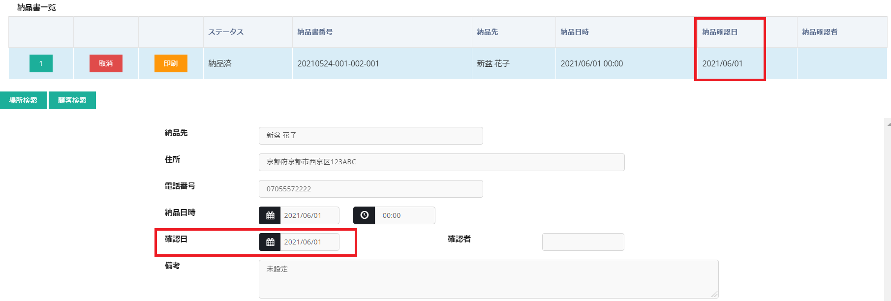 確認日は、納品画面で手動で設定しても納品済ステータスになります。