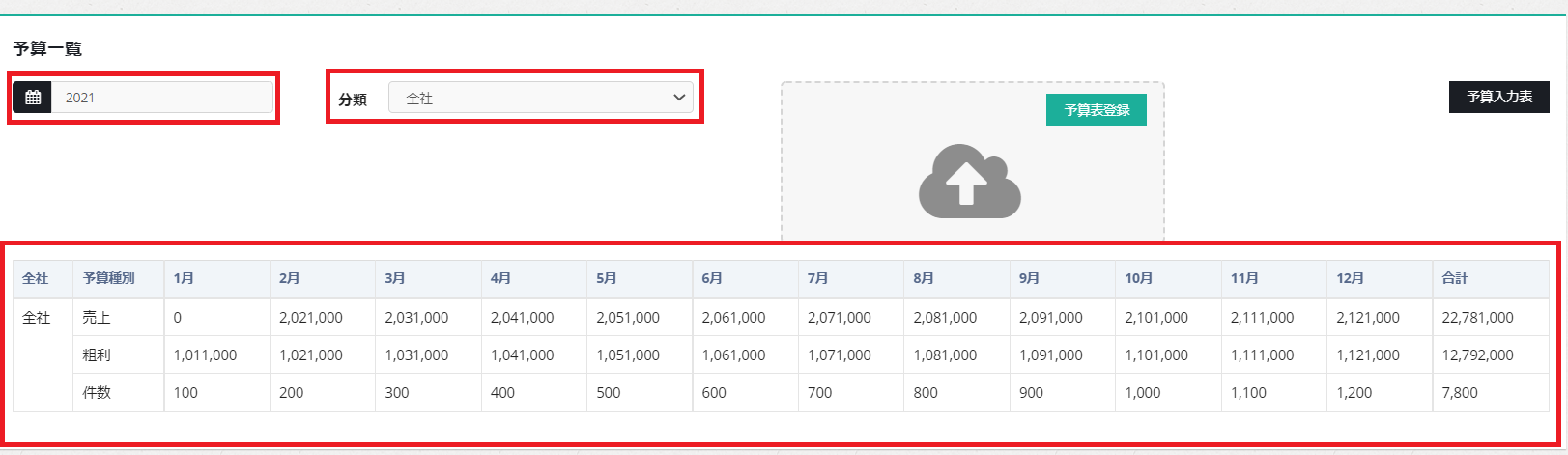 年指定プルダウンと、分類プルダウンで選択した分類の、登録済み予算一覧を表示します。
