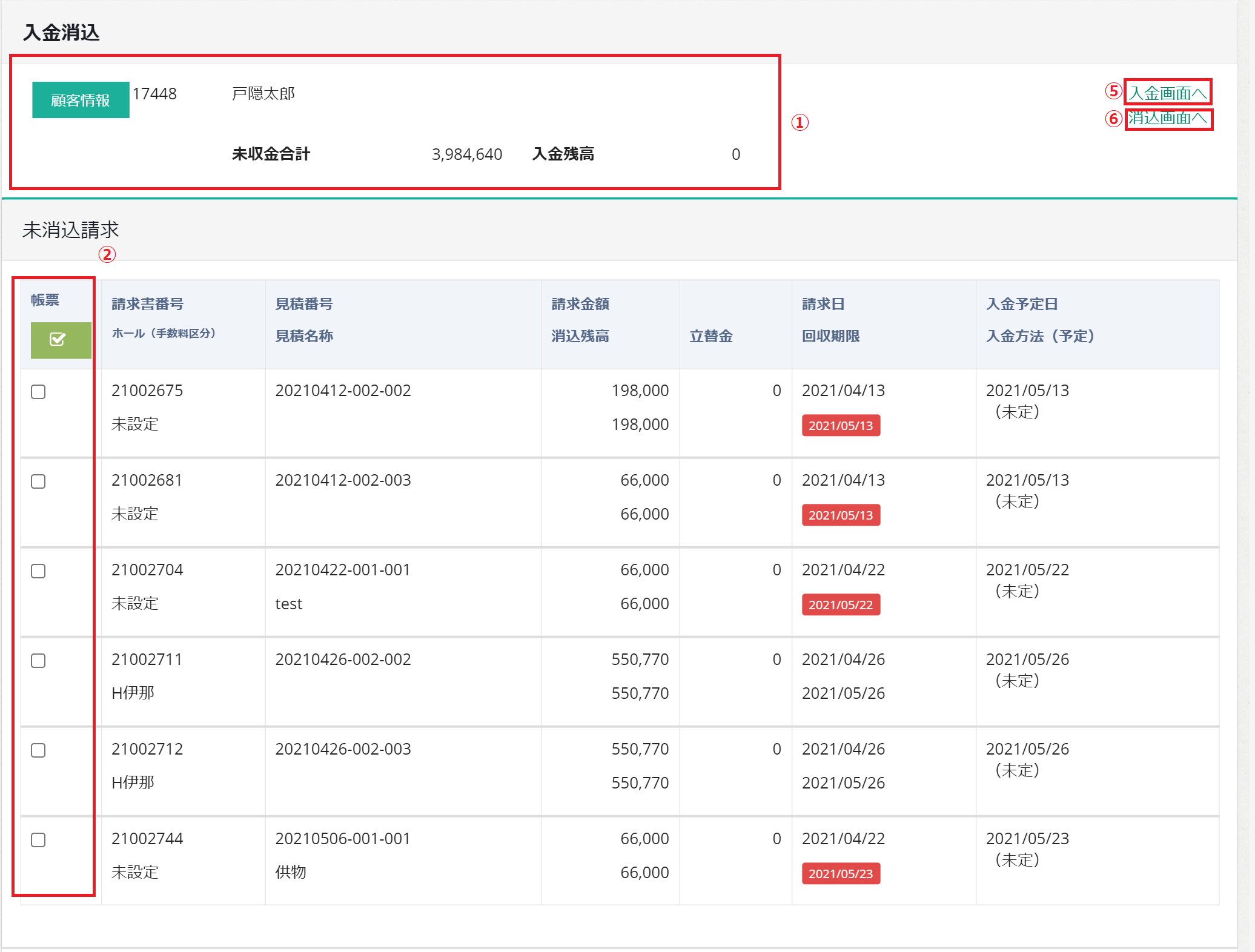 顧客情報を引継ぎ、請求書を選択し、入金と同時に消込ができるようにする画面です