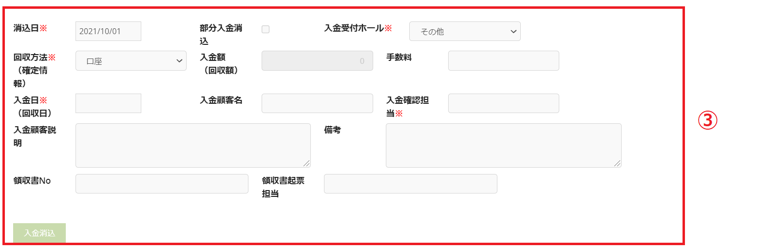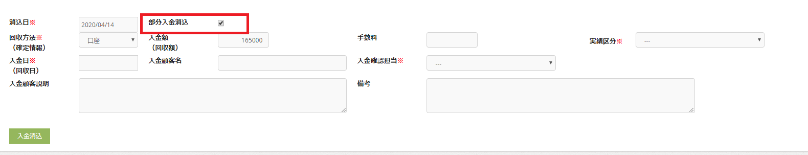 「部分入金消込」チェックボックスにチェックを入れると、消込する金額を設定することができます。設定した金額分入金と消込が同時に行われます(部分入金消込した金額だけ未収金合計から差し引かれます)。入金時の承認ボタンがないのでご注意ください。