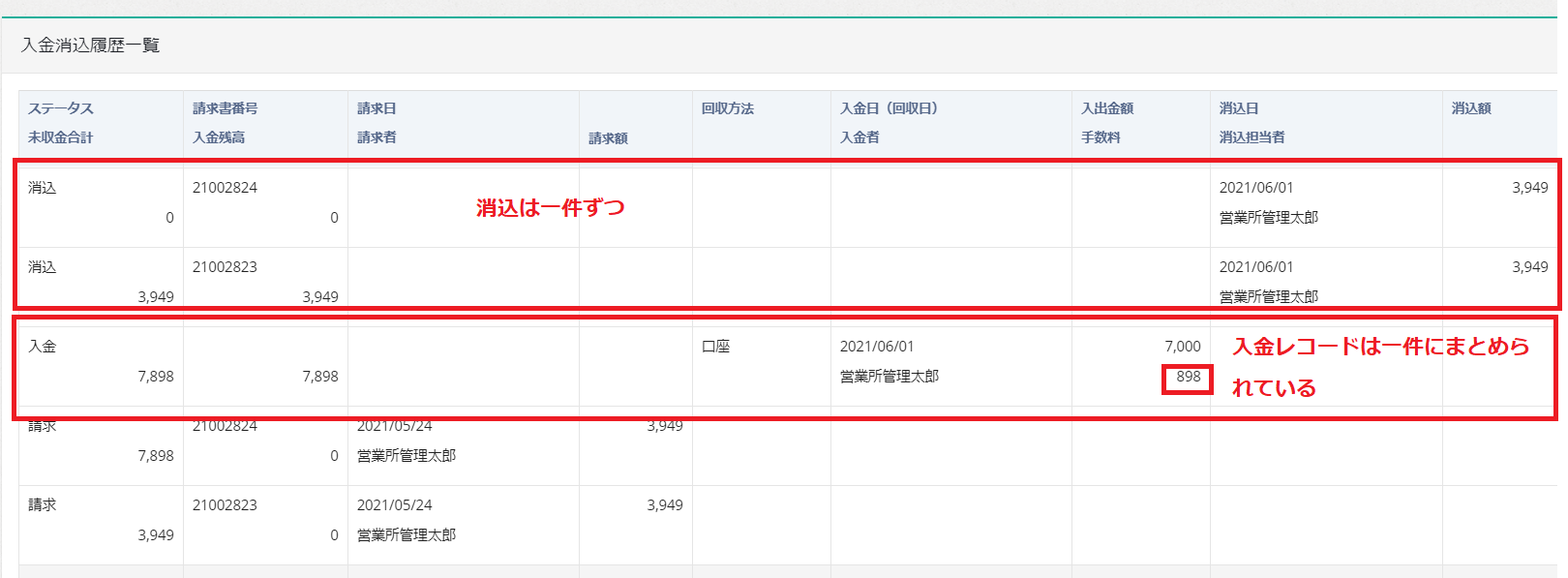 例)3949円の請求を2件計上し、2件を一括消込する場合