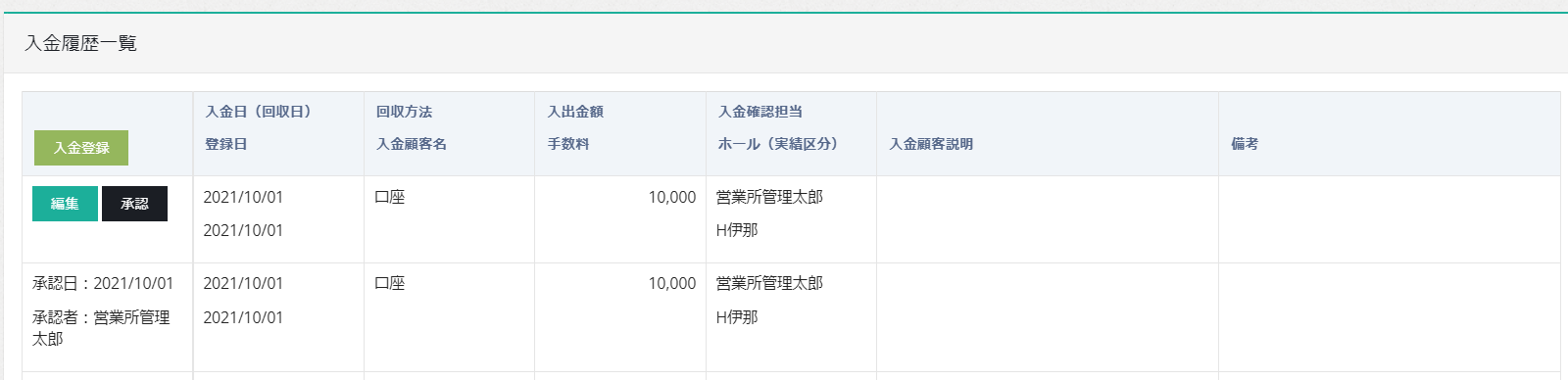 入金履歴を表示するエリアです。「承認」ボタンも表示されるため、承認権限のあるユーザが承認ボタンをクリックすると入金処理が完了します