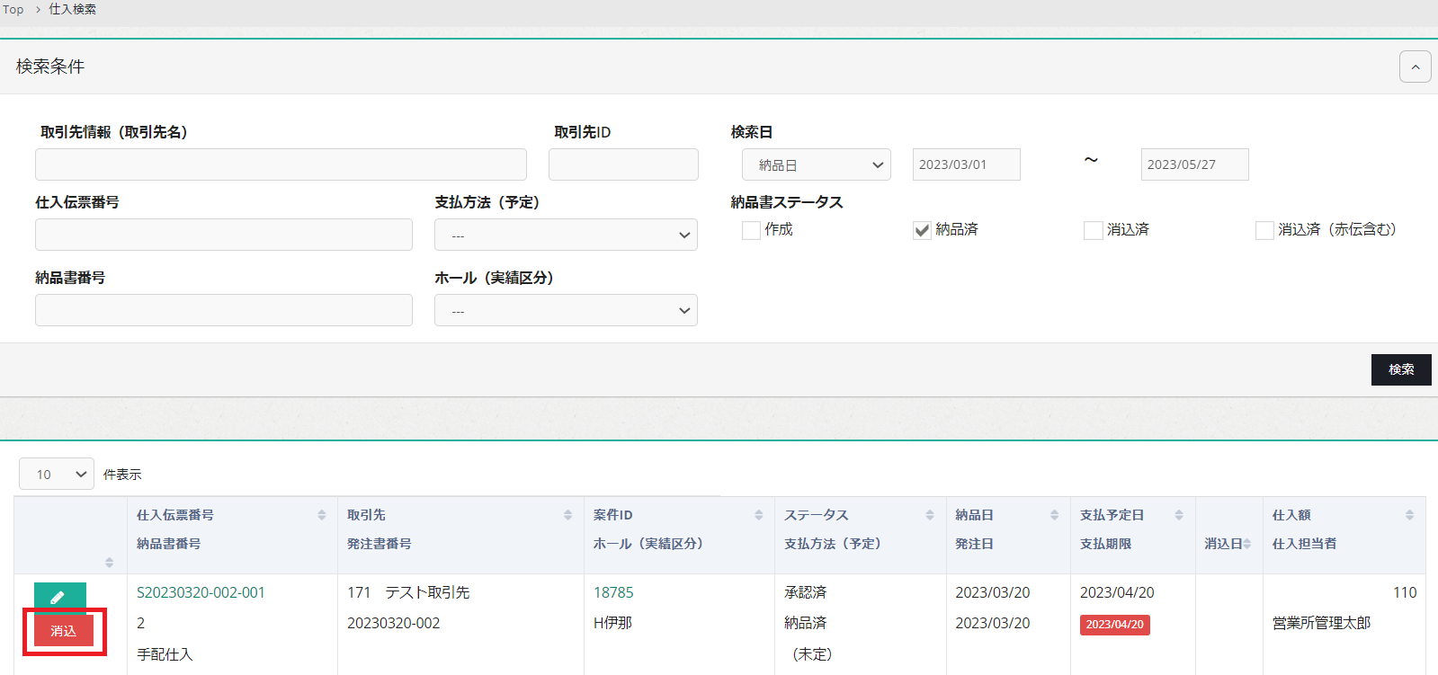 - 消込ボタンを押すと消込が実施されます。債権額 > 消込可能金額の場合は消込ができません