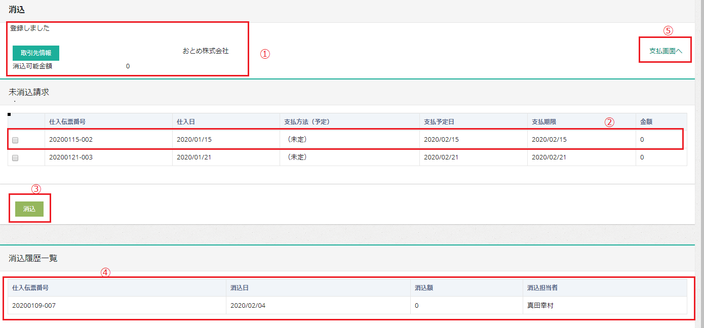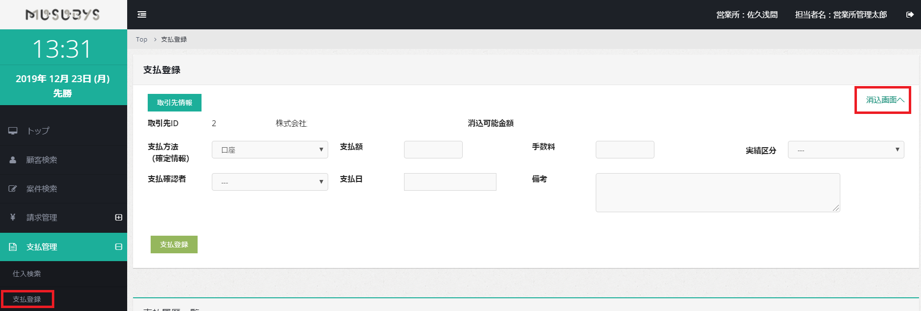 - 支払登録画面で取引先を指定すると、右側に消込画面へのリンクが表示されるので、そこからアクセスする